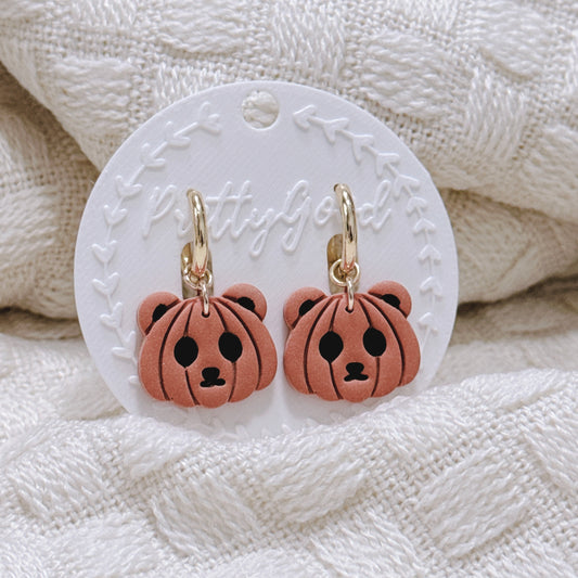 Pumpkin Bear Earrings, Handmade Polymer Clay Halloween Huggies, 14K Gold Plated Cute Spooky Jewelry, Gift for Her