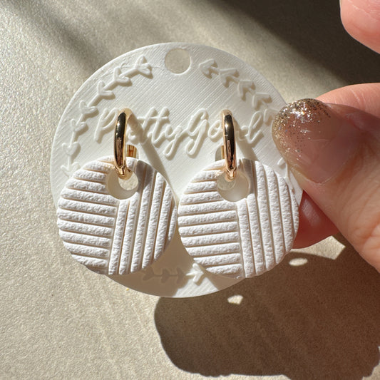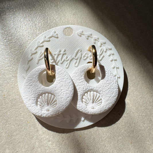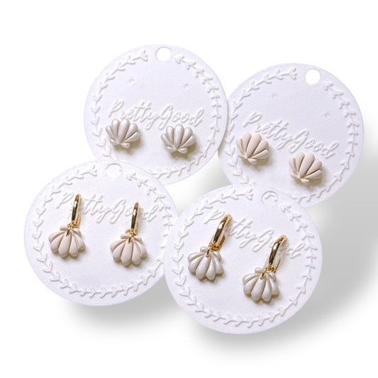 Mini Scallop Shell Clay Earrings – White Dangle on Gold Huggies