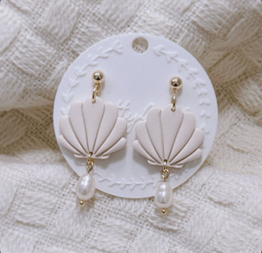 Handcrafted Clam Shell Earrings with Freshwater Pearls – Polymer Clay Coastal Dangle, Gift for Her