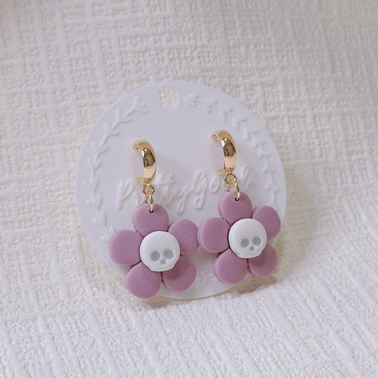 Spooky Flower Skull Earrings Pink Purple Polymer Clay Huggies Handmade, Summerween, Halloween, Gift for Her